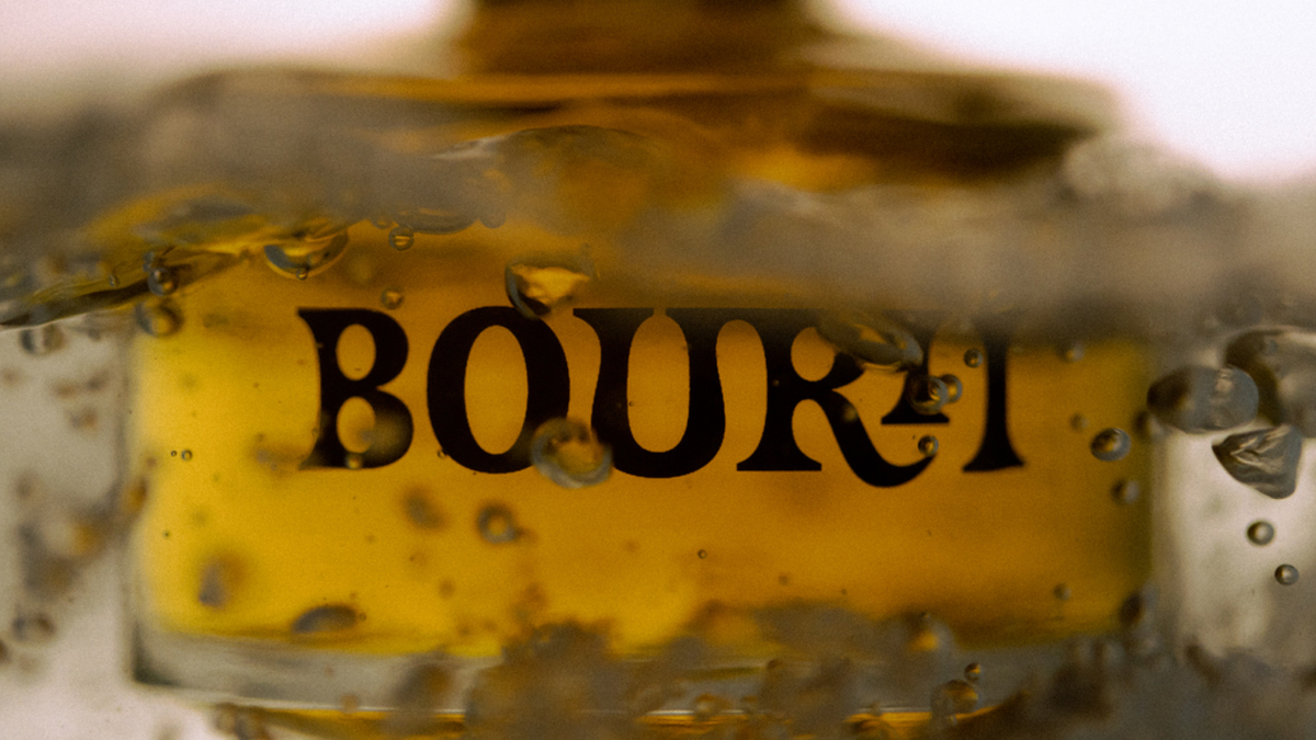 Abstract orange and yellow swirls and streaks on a light background.A woman with braided hair smiles while holding a bottle labeled "BOURI."