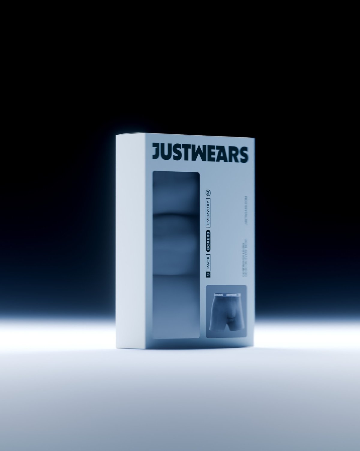A person wearing black JustWears boxer briefs is shown mid-stride against a light gray background.A dark teal box of JustWears Active 3 Pack boxer briefs is shown against a black background. The box features the brand name, a clear window displaying the briefs, and a small image of the briefs.