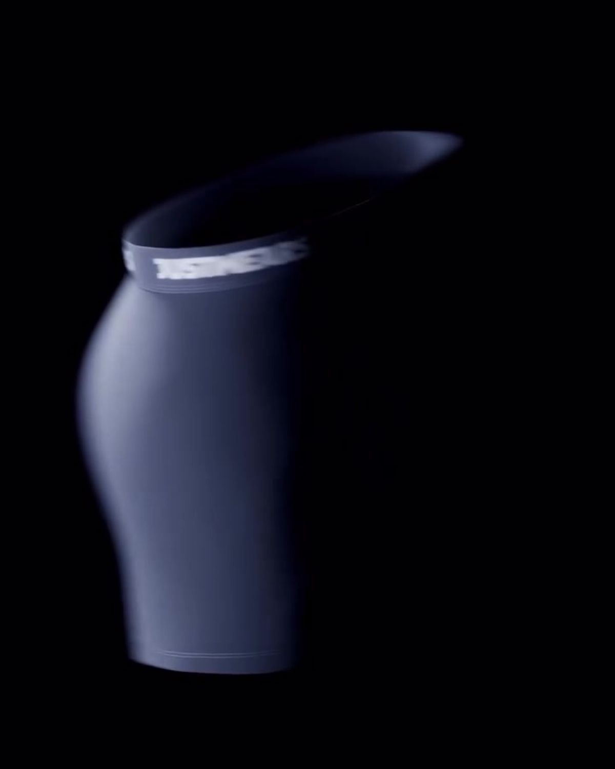 A person wearing black JustWears boxer briefs is shown mid-stride against a light gray background.A dark teal box of JustWears Active 3 Pack boxer briefs is shown against a black background. The box features the brand name, a clear window displaying the briefs, and a small image of the briefs.